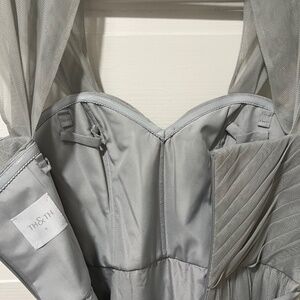 NEW WITH TAGS, stunning gown in Silver Mist (a discontinued blue-grey color), with adjustable straps (can add straps, take them off, wear the sleeves as off-the-shoulder cap sleeves, etc.). In size small. TH&TH is a luxury UK gown brand, specializing in bridesmaids dresses. It's a hard-to-get brand in the US, and this retails for over $280 plus shipping.