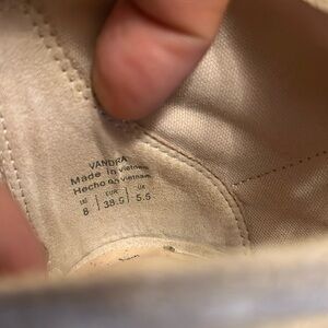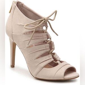 This is a tan colored pair of the women’s Kelly & Katie Vandra heels. An almost open lace-up shoe that gives the appearance of sandals but have the standard 4” heel height and has a zipper in the back for easier accessibility. Great pair of open toe heels for many different occasions!