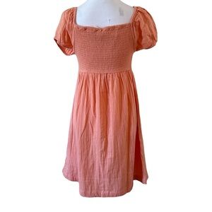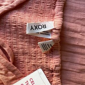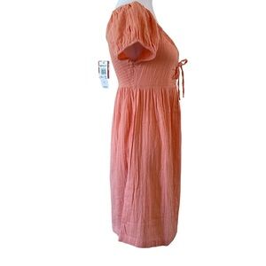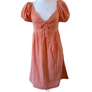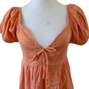 Roxy Women’s Clearwater Cove Mini Short Sleeves V-Neck Dress Orange Size M NWT. Double soft cloth fabric dress. Lightweight 100% cotton v-neck with drawstring detailing. Puffing sleeves with elastic cuffs. Chest armpit to armpit 16”, sleeves 7”, length from shoulders to hem 34” Very soft. Fresh cute feminine look.