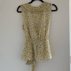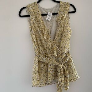 Max Studio sleeveless white blouse with yellow floral pattern, new with tags. Size small. Perfect for work or dinner outing. Ties at the waist.