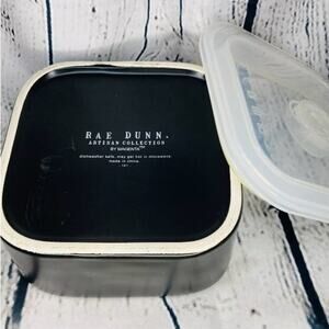 Black with white lettering portable food container with sealable lid. Dishwasher safe and not microwavable.