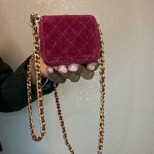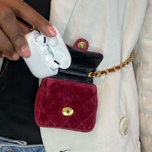 Beautiful rare Chanel nano purse. 24k gold on the hardware and velvet material in red. Perfectly fits airpod pro perfectly. Perfect length to wear with another bag and for travel. Has some wear on the back corner, shown in photos but otherwise perfect condition. Comes with COA (Entrupy).