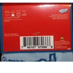 Men's white, blue and red Hawaiian Punch crew socks, featuring Punchy. 97% Polyester, 3% Spandex. Fun throw back novelty socks! Designed to fit Men's shoe sizes 6-12. Would also fit Women's shoe sizes 9-13. Cute graphic printed crew socks. Perfect for the snack geek or gamer in your life! New! Please see photos for details.