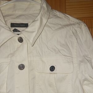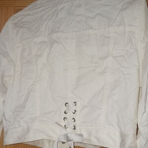 WHITE HOUSE BLACK MARKET WHITE JEANS JACKET LADIES 12 LACES UP BACK $138 RETAIL .....GORGEOUS STYLE!!! UNIQUE BACK. THIS HAS SOME STRETCH TO IT. MATCHES SOOOO MUCH FOR SPRING AND SUMMER.