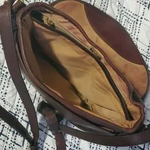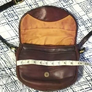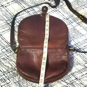 Classic burgundy chestnut cowhide leather purse with 45" adjustable shoulder strap. Three pockets with one interior zipper pocket. The strap is well worn with damage, and there is light interior staining from age/ pen ink/ etc. Otherwise good pre-loved condition with lots of life left- price reflects wear.