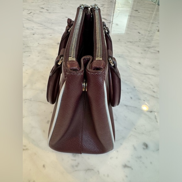 RARE FIND! This authentic Prada bag has been babied and very gently used. It is in excellent and clean condition with no damage or signs of wear. This is a rare bag - hard to find! It has white piping and in burgundy color. Silver hardware. Very pretty! Comes with strap, dust bag and cards.