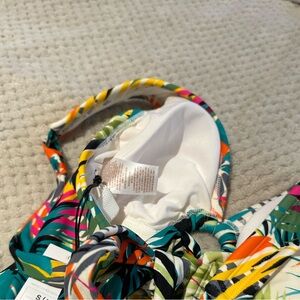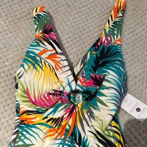 Bring tropical flair to your poolside wear with this Plunge Ring Detail One-Piece Swimsuit from Shade & Shore™. This medium-coverage swimsuit features a multicolored palm leaf print for a standout look and a plunging V-neckline with a keyhole ring detail. Made from stretchy fabric with elastic at the leg openings, it offers ease of movement in and out of the water. The crisscross back with adjustable tie straps makes it easy to find just the right fit, and the removable padded cups offer customized coverage.