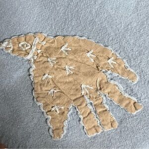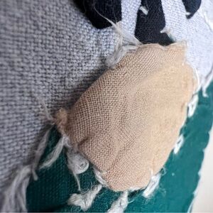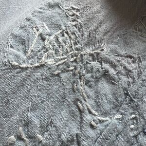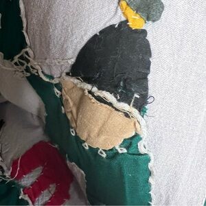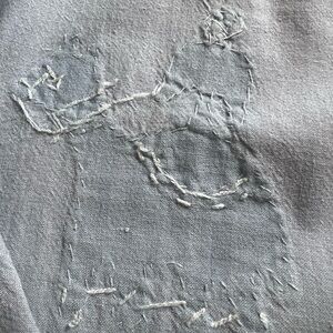 This garment is structurally sound and there are no stains, holes, rips or tears to the shirt, but as noted above the blue color has fading. The appliqués appear to have been hand-sewn. Photos of the inside stitching are the last two photos. Over time, some of those threads became loose. If you are handy with a sewing needle, I imagine it may be an easy fix to reinforce the stitches as needed. There is also a small piece of fabric at each shoulder where shoulder pads once attached. Shown in photo 13. Please see all photos for details.