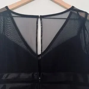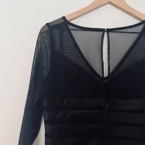 DESIGN: Black ribbed stripes, mesh sleeves, V-neck, corset effect, fitted silhouette