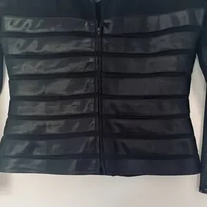 FEATURES: Mesh sleeves, zip up back, V-neck, corset effect, ribbed texture, keyhole back detail
