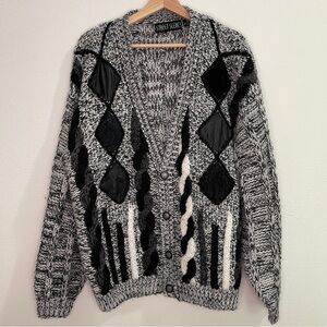 Vintage 80s Street Scenes Chunky Knit Leather Patches Cardigan - Black & White