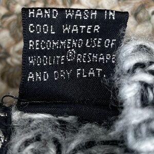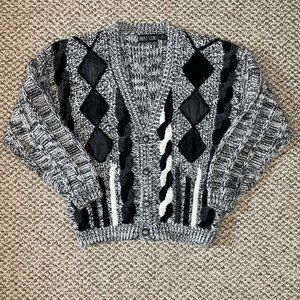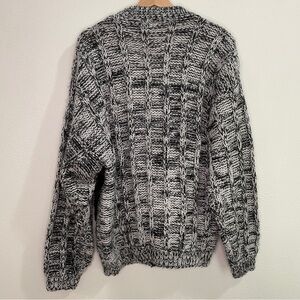 Preowned in great condition. Some pilling. 100% Acrylic with black genuine leather and suede leather patches. Button closure. Silver tone metal and black plastic buttons with the great seal of the state of Oklahoma 1907. V-neck. One chunky knit pattern on the back and sleeves. A different one on the front. The front also has the leather patches in diamond patterns and chunky 3-D knit designs. Ribbed knit cuffs, hem, and along opening. Long sleeve. Locker loop label. Hand wash with Woolite and dry flat. Cosby style. Coogi style. Oversized.