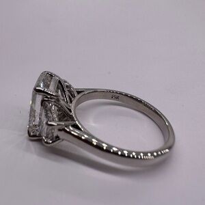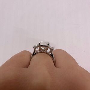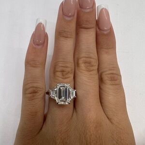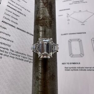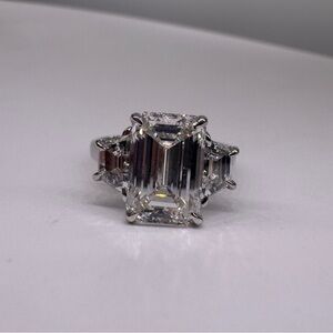 4.02 carat F VS1 emerald cut lab diamond engagement ring three stone