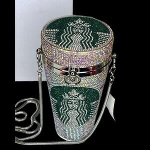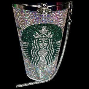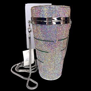 NEW LG Starbucks Coffee Cup AB Crystal Rhinestone HANDBAG Purse Bag Silver Chain