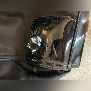 Nylon tote embellished with tonal patent leather inserts and logo, double padded handle, magnetic closures, lined inner featuring one inner zip pocket.