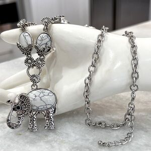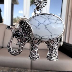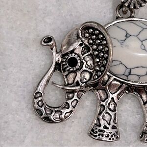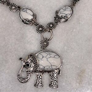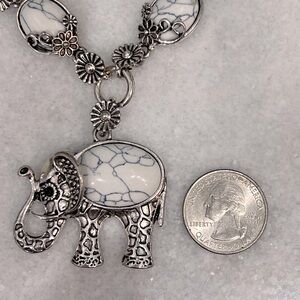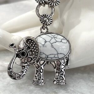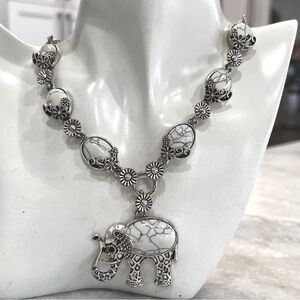 White Howlite Black Oxidized Silvertone Elephant Floral Necklace
