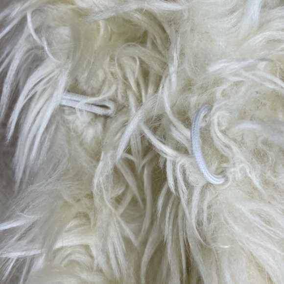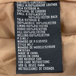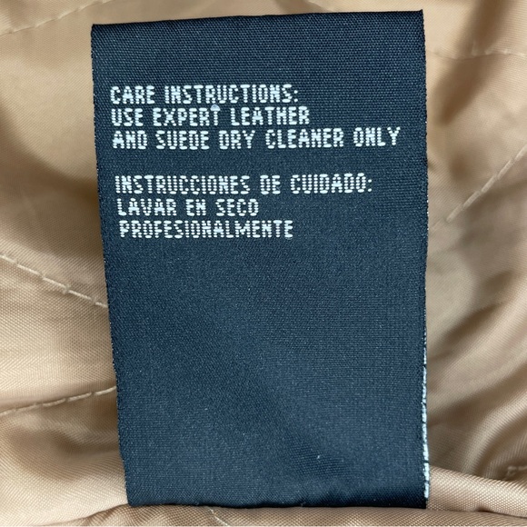 Preowned in great condition. A few miniature pin size holes on the left arm. The same arm has some barely noticeable marks that probably will come off with cleaning. See pictures. 100% genuine leather patches in browns, taupe, and tan. 100% Acrylic cream faux fur trim. Fully lined with a quilted 100% Polyester lining. Hook and loop closure. Long sleeve. Locker loop.