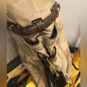 Perfect Size Coach purse, gold accents and lizard look brown straps on this signature Coach Fabric are Devine! This has been one of my favorite bags. I hand washed it, and the beautiful satin pink insides are very clean. It has a zipper pocket and flat pockets for your phone, pens and much room for your other needs. Great for work or travel with the zipper top! Make reasonable offer ๐
