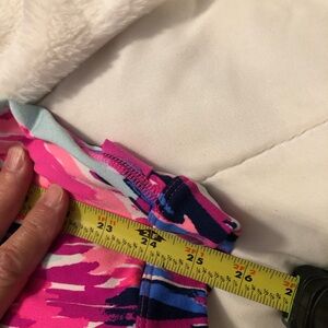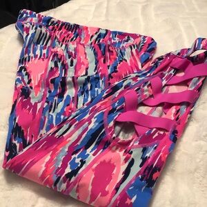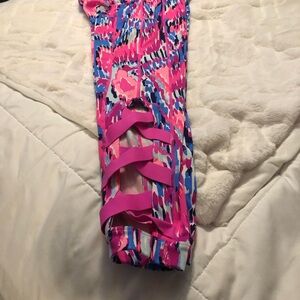 Lily Pultizer UPF Luxletic Weekender Leggings Criss Cross Lattice Design On Bottom Of Legs Multicolored
