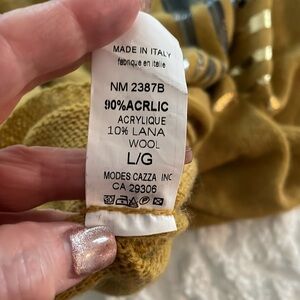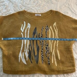 This beautiful delicate knit sweater, a cross between chartreuse and mustard, is embossed either gold, silver and animal print