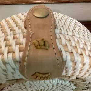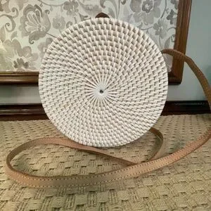 Round wicket purse with snap closure. Strap is 48”. Size is 8x8” and 3” deep. Inside is li ed with fun, colorful fabric. Never used. Excellent condition.