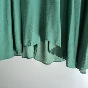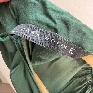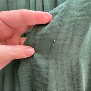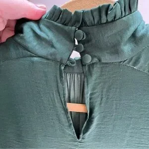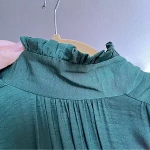 Gorgeous dark green midi dress with ruffled collar, and covered buttons at neck and cuffs. No fabric tag but feels like rayon. Empire waist, keyhole at back neck and hidden side zipper. Slightly longer in back than in front to create a flattering line. Tiny pull inside of left sleeve (pictured.)