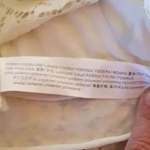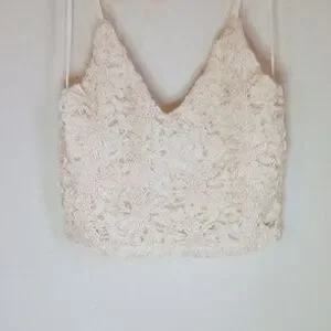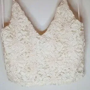 Beautiful lace spaghetti strap crop top with crochet embroidered detailing on the front. This top is lined and is a women's size small. Excellent pre-owned condition with no flaws noted.