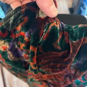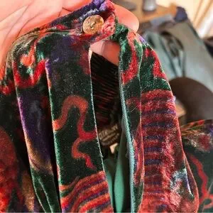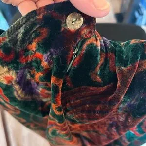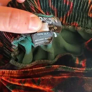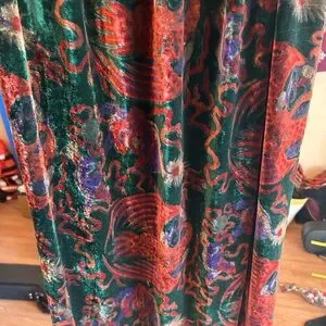Beautiful and in excellent condition 100% silk skirt. Beautiful lustrous deep green and reds and purples. Phoenix designs on skirt with a stretchy waist and a slit on the left side. Very cute and warm in winter and cool in summer because it is silk and not synthetic materials. 14 inch waist on one side so 28 inches total NOT stretched. Stretched it gets to 18 inches on one side so approx 36 inches total stretched. It would be tight at total stretch but just letting you know it gives a bit at the waist. Has an elastic band inside the waist band only on the back. Just too small for me or I would keep it.