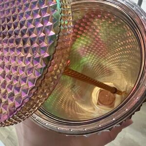 Beautiful iridescent cup. Studded straw. Picture shown are with and without flash.