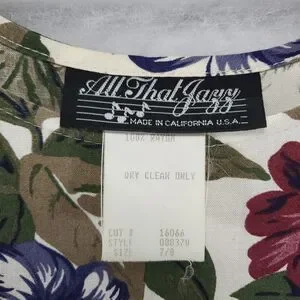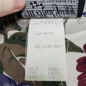 Size 7/8, flat measurements in photo 33. All That Jazz, 100% Rayon, has some pilling and some light stains, plus two small holes which could easily be patched with an iron patch (I can do this for you upon request) on the underside of the dress.