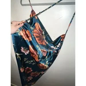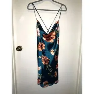 Women's Teal Floral Silk Adjustable Strap Open Back Drape Mini Night Dress
