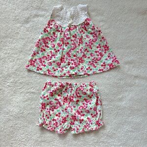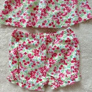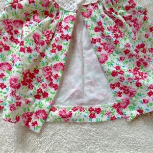 Floral pattern throughout with a knit look at the neckline. Three buttons in the back and an open back. Shorts with a fluttery style to them. In very good used condition. The flowers are red with a hint of pink. There are pale yellow flecks throughout.