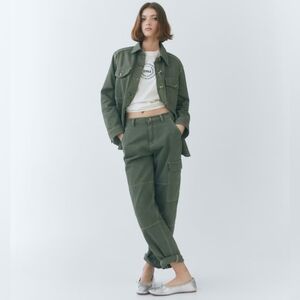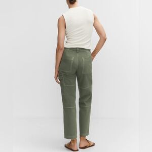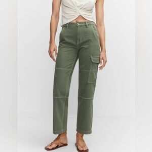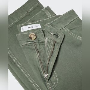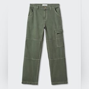 Denim style cotton fabric. Cargo design. Straight design. Medium waist. Side pockets. Side pocket. Two patch pockets on the back. Decorative seams. Loops. Zip and one button fastening. Inside length 29.5 in.