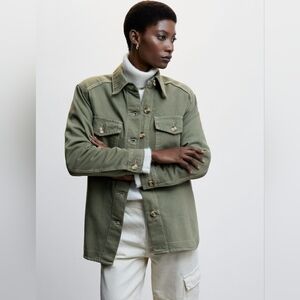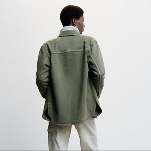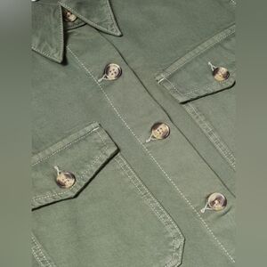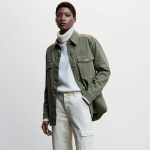 100% cotton fabric. Straight design. Shirt-style collar. Button fastening on the front section. Two-buttoned flap chest pockets. Long buttoned sleeve.
