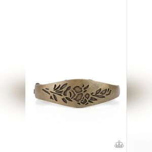 The front of a thick antiqued brass bangle-like bracelet is stamped in a leafy floral pattern, creating a whimsy centerpiece around the wrist. Features a hinged closure.