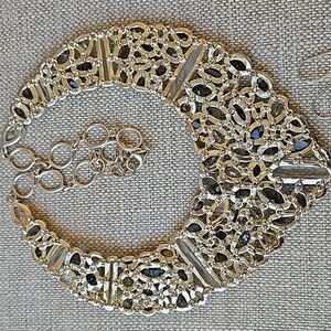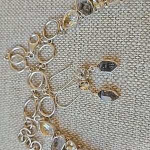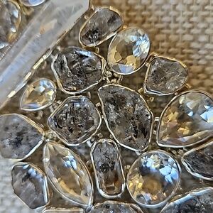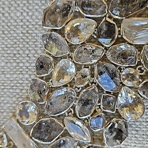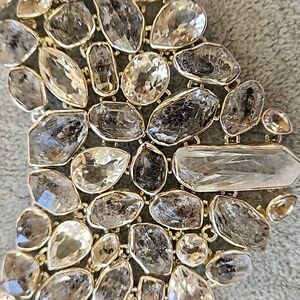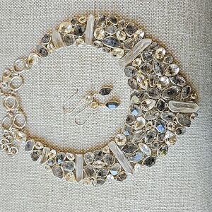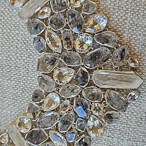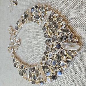 This is an amazing piece of jewelry artwork at its best. Bought on JTV, from the Artistry Of India, you can see all the stones, silver and all the work it took putting this piece together. This is a gorgeous, stunning, beautiful ( I could go on and on) necklace. Made with rutilated black quartz, white quartz and clear crystal it is a very soft color tone. This piece is substantial but lays wonderful the decolletage. The earrings are my gift with this piece. I have never worn this piece, as you can tell from my closet. I have been many jewelry reps and the biggest collector myself!