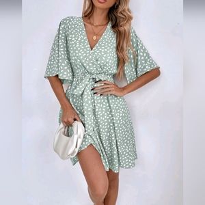 * New Boho Short Flutter Sleeve Wrap Front Dress Belted Green White