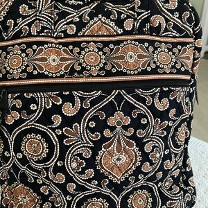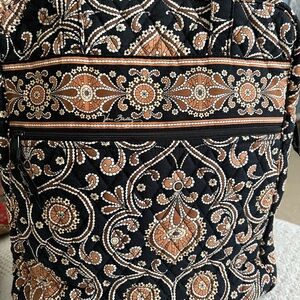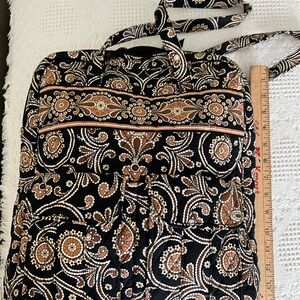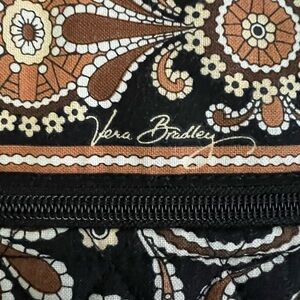 Vera Bradley bag of black, brown and tan in excellent used condition. Measurements in the pictures. Zippered pocket on back, two double snap pockets on the front, one large zippered pocket inside and also 3 slide pockets ( ie: for a iPhone ). Perfect for travel, books, or iPad…. Many uses. Excellent quality. Smoke free home.
