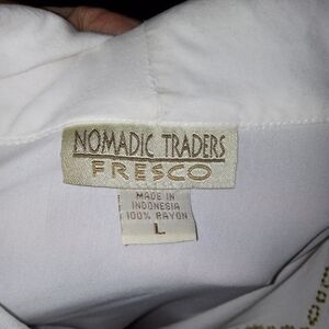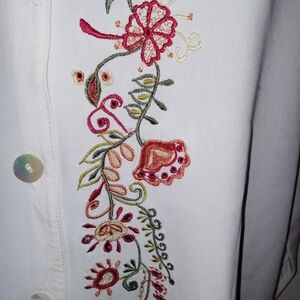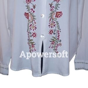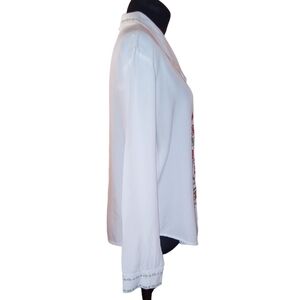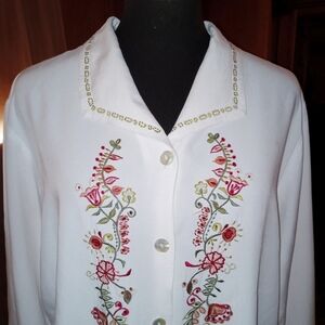 White long sleeve button front, notch hem button front blouse, floral and leaf embroidery on front and green embroidered trim at cuffs and sleeves. Excellent preloved condition without flaws Vintage 80s embroidered blouse by size fresco by Nomadic Traders Large