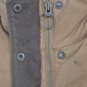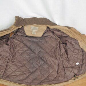This listing is for a Ladies' LL Bean Vest Style 0 DBM3. It is made of a light brown treated quilted cotton with dual zip.button waist pockets, and zip/button closures. It has down insulation with a nylon lining and elastic at the bottom.