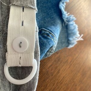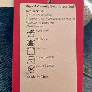 Distressed Maternity denim shorts with belly support,adjustable elastic band. Front and back pockets.
