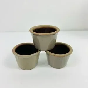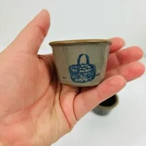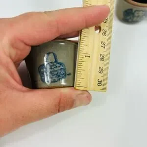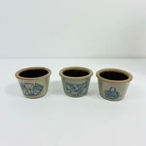 Features: Set of 3 miniature glazed stoneware crocks. Handmade. One features a basket, one a patriotic teddy bear with flags, and the last one is a cow. They are very unique!