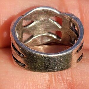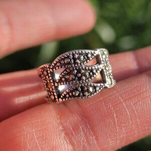 Stunning vintage Art Deco style ring in solid 925 sterling silver. Adorned with marcasites, MISSING two...not noticable when worn. Three swirled marquise style stacked in the center with a double shank style on the sides with two vertical bars...bars are missing one out of three marcasite each for two total. Stamped "925" inside the band, faded. About a size 3.5, good midi or pinky ring. Natural, beautiful patina included. May need a cleaning depending on your preferences. Tested with a neodymium magnet and JSP acid, guaranteed sterling.