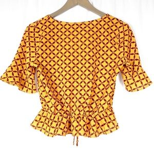 Forever 21 Geometric Print Cinch-Front Blouse with Flowy Sleeves Mustard Yellow