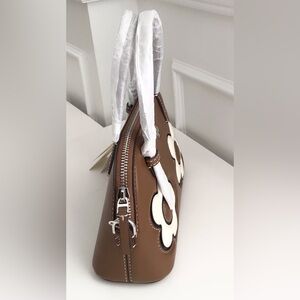 This Tory Burch Emerson Dome Satchel Crossbody Bag is a stylish accessory for any occasion. The bag features a beautiful floral pattern and applique accents on a brown leather exterior. It has a zip closure and double handles with a 4" drop, making it a perfect mini bag for parties or casual outings. The interior is lined with fabric and has inner pockets for easy organization. The crossbody strap is adjustable up to 22" and has a drop of 22" as well. The bag is part of the Tory Burch Emerson product line .