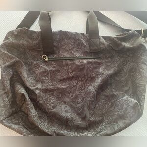 Sakroots Packable Duffle Bag lightweight gray/black floral print has handles and shoulder straps.