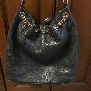 This really cute Michael Kors black bag has really cute gold hardware. It has a a gold chain for a “drawstring” with black leather woven through the gold chain. Has adjustable strap. Has a zipper pocket in the inside and 3 regular pockets. Clean inside too.