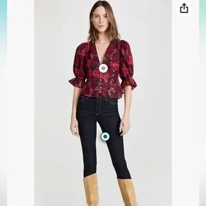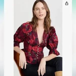 • Floral print, Covered elastic detail at back, V neck and 3/4 length puff sleeves with covered elastic flounce cuffs