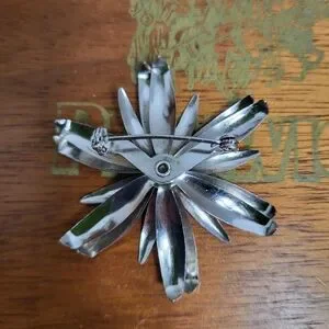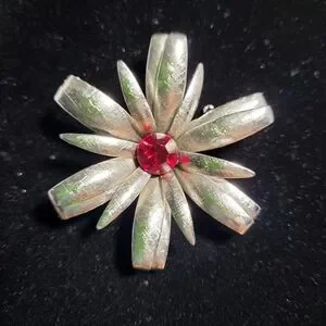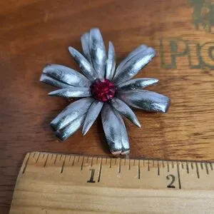 Vintage Silver Tone Daisy with Red Rhinestone Centre Brooch