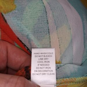 EUC Beautiful semi-sheer, lime, blue, coral, black and orange tropical floral/striped tunic with elaborately beaded neckline, from Melissa Paige. Tunic has 3/4 sleeves with cold shoulder cut-outs, and hem has slits on either side. I'm five foot five, and tunic hits me about mid thigh, so this would be a perfect swim cover, great for vacation since you get two looks for one. Bust 25, waist 24, hem 23 7/8 inches. Length approx 29 inches, please see all photos.